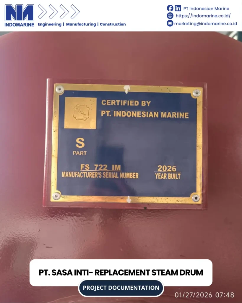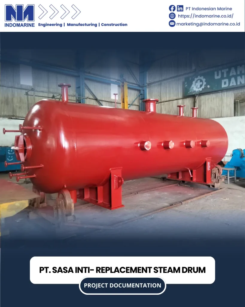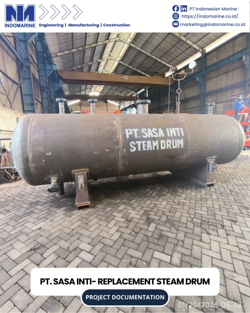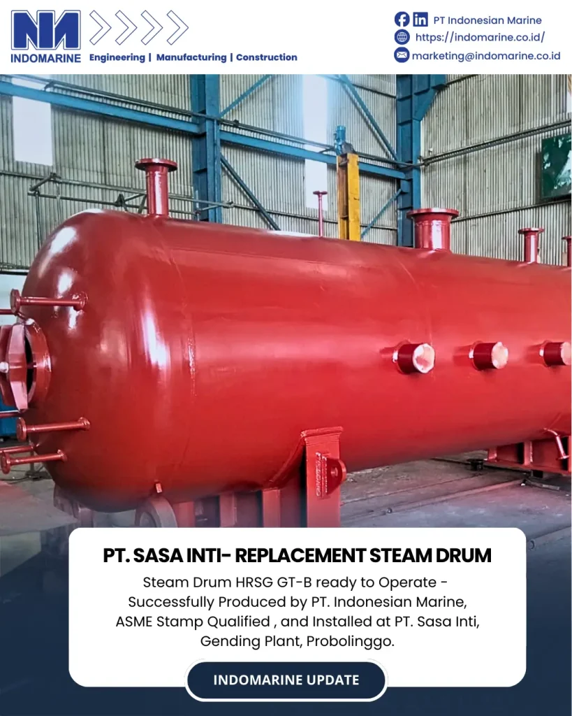Steam Drum baru diproduksi oleh PT Indonesian Marine dengan standar ASME Stamp, melalui proses fabrikasi yang terkontrol serta tahapan inspeksi dan pengujian sesuai prosedur yang berlaku.